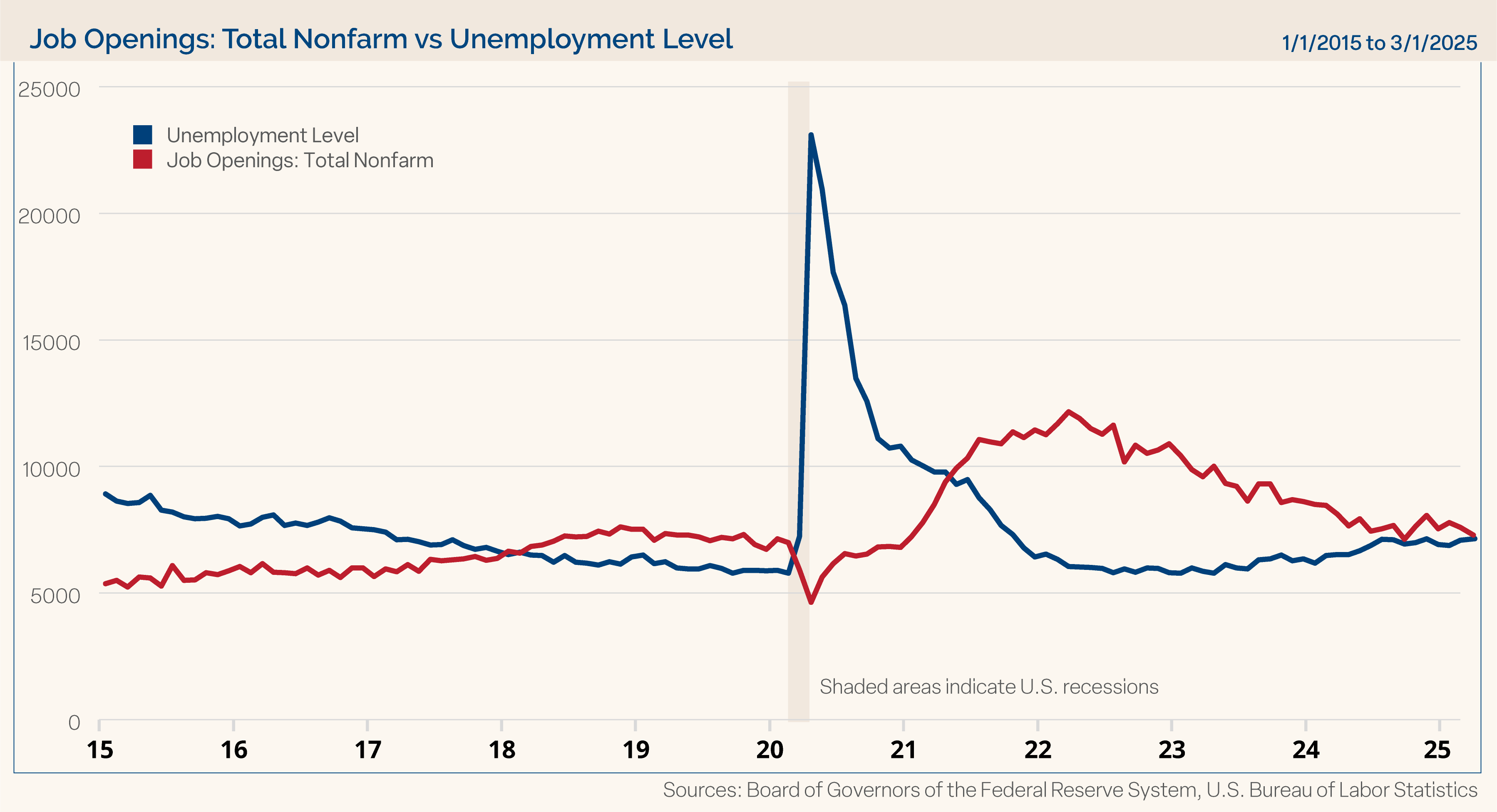 Jobs: Although rearview looking, the job market has remained resilient. In March, payrolls increased by 228,000, well ahead of expectations of 140,000. However, the prior month was revised to show fewer additions, and the unemployment rate ticked unexpectedly higher to 4.2% in March from the expected level and the prior level of 4.1%. Job openings dropped rather sharply in March to under 7.2 million from just below 7.5 million in February. This might be an initial reflection of businesses pausing some of their job hiring activity in light of the uncertainty around tariffs. Interestingly, layoffs declined by 222,000 in March. At this point it looks like companies have frozen hiring but have not enacted massive layoffs. We will monitor to see if slowing hiring activity shows up in other job market numbers in the months ahead. Chart 1 shows the unemployment level and the number of job openings. Clearly the spread between these two measures has closed in recent years and the numbers are close to sitting on top of each other in March, but job openings remain at a modestly higher level.