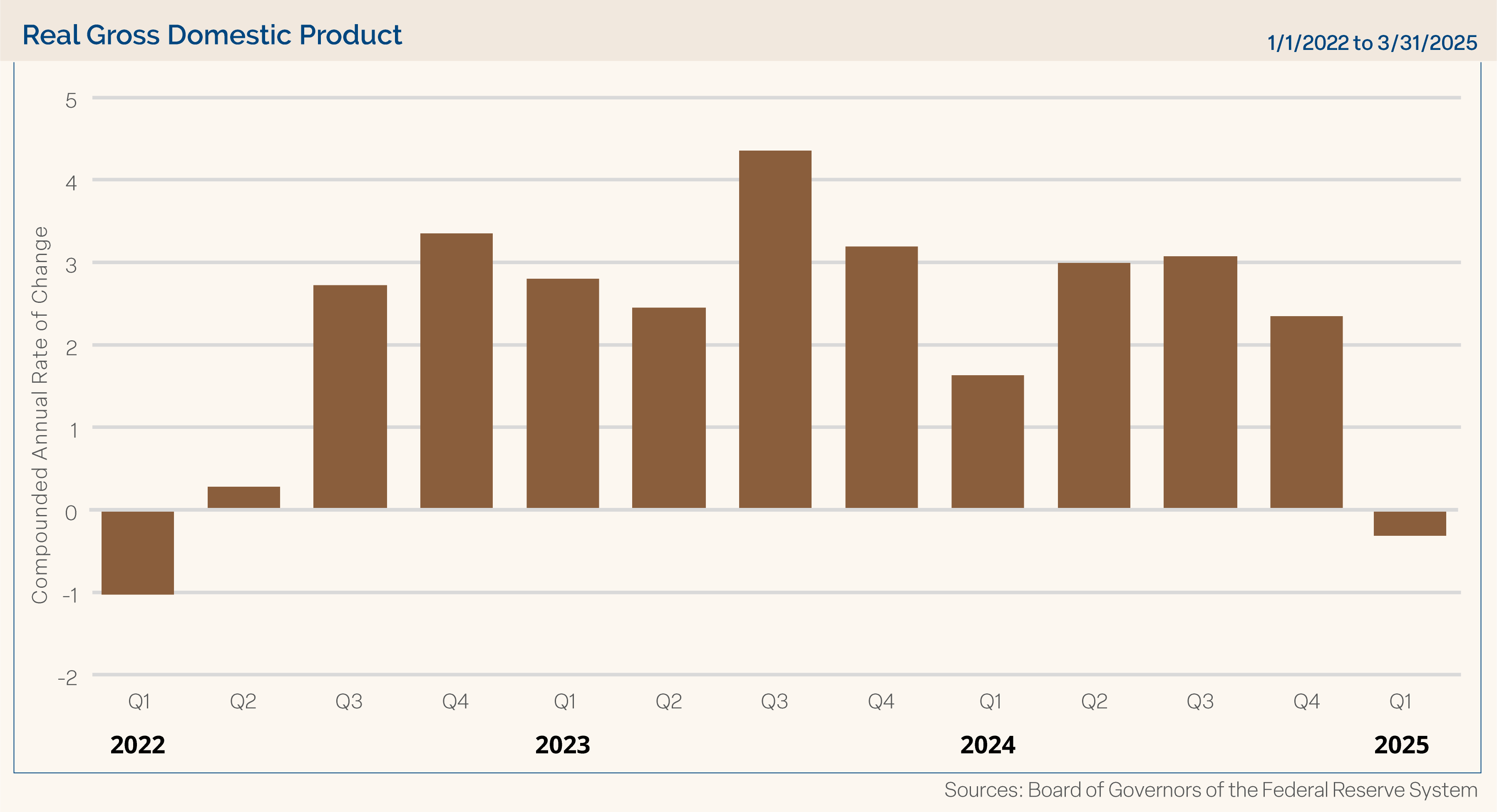 GDP: The advance reading of Q1 2025 was reported at the end of April, and it reflected a decline in economic activity with an annualized drop of 0.3%. Estimates were at -0.2%, but this was the first quarterly decline in the economy since the first quarter of 2022. We had been expecting some weakness due to a spike in imports as businesses stockpiled inventories in the first quarter ahead of anticipated changes in tariff policy. However, it was unwelcome news that economic activity declined after a solid year of expansion in 2024. Although above expectations, the personal consumption component of Q1 GDP was rather modest at a 1.8% annualized rate (expectations were 1.2%), when by comparison, the Q4 2024 personal consumption rate was 4.0%. We have consistently said it takes a lot to knock down U.S. consumers, but spending activity did slow in the first quarter as some of the tariff concern headwinds were building. We hope this turns out to be an anomalous GDP reading, and the current Atlanta Fed GDP Now estimate shows expected Q2 2025 to come in at a 2.4% annualized pace (as of 4/30/25). Chart 3 shows GDP readings since Q1 2022.
