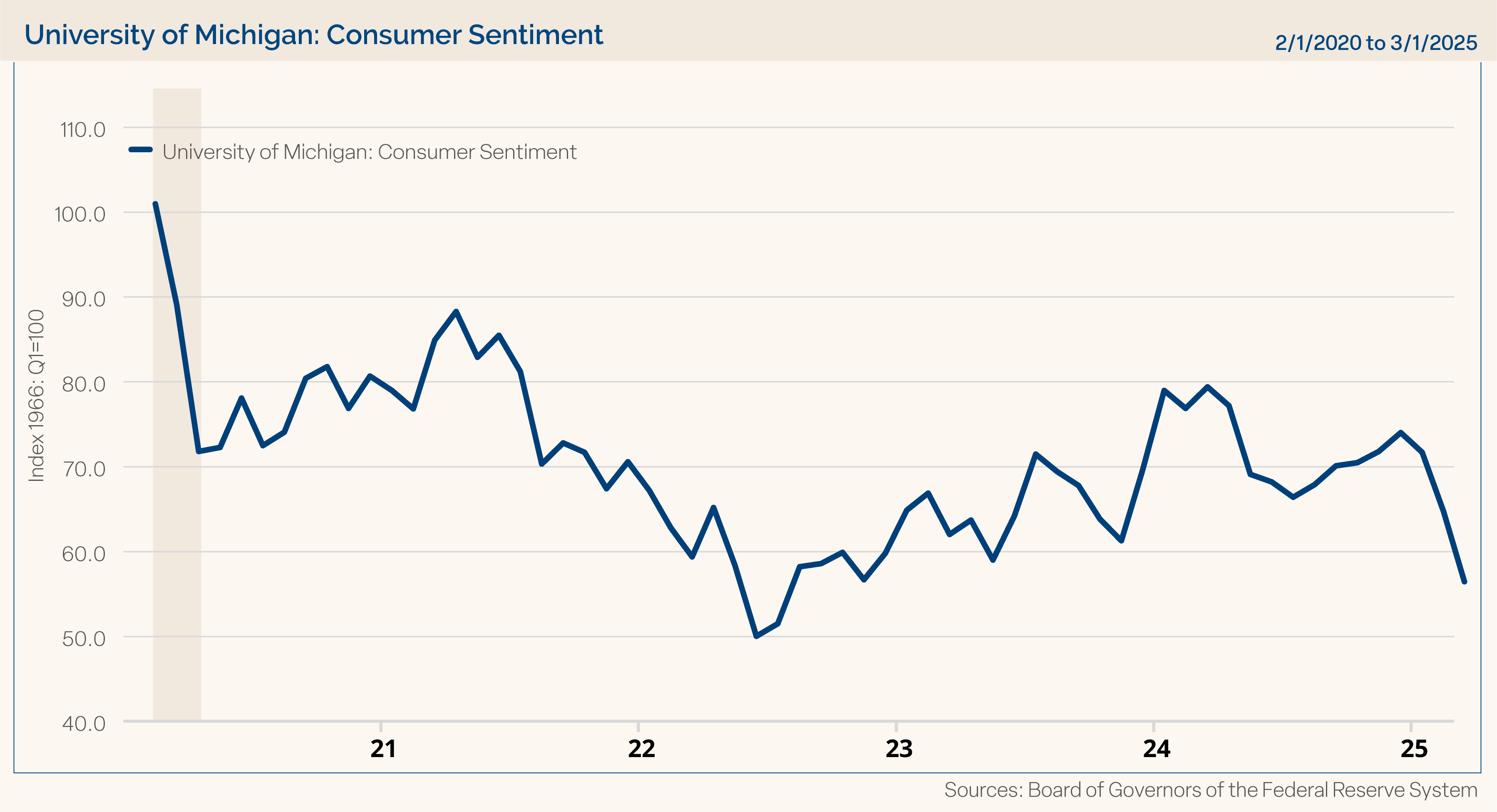 Consumer Confidence: One economic data point that has been heavily affected by the tariff discussions and resulting economic uncertainty has been consumer confidence. Consumers are clearly saying they are not as confident in 2025. The University of Michigan consumer sentiment reading has fallen dramatically in recent months. It is important to watch what consumers “say” in confidence surveys; however, we think it is more important to monitor what consumers “do,” meaning spending data. We will monitor whether this drop in consumer confidence translates into less spending by consumers in the months ahead. Chart 4 shows the consumer sentiment reading from the University of Michigan. This data is delayed by one month on the chart, and we know the preliminary sentiment reading has fallen further to 50.8 for April. The fall in consumer confidence in April approaches the weakest confidence readings we have seen in years, only surpassed by levels from 2022. For comparison, this reading stood at 101 for February 2020, and it stayed above 70 during the remainder of 2020 as we dealt with COVID.