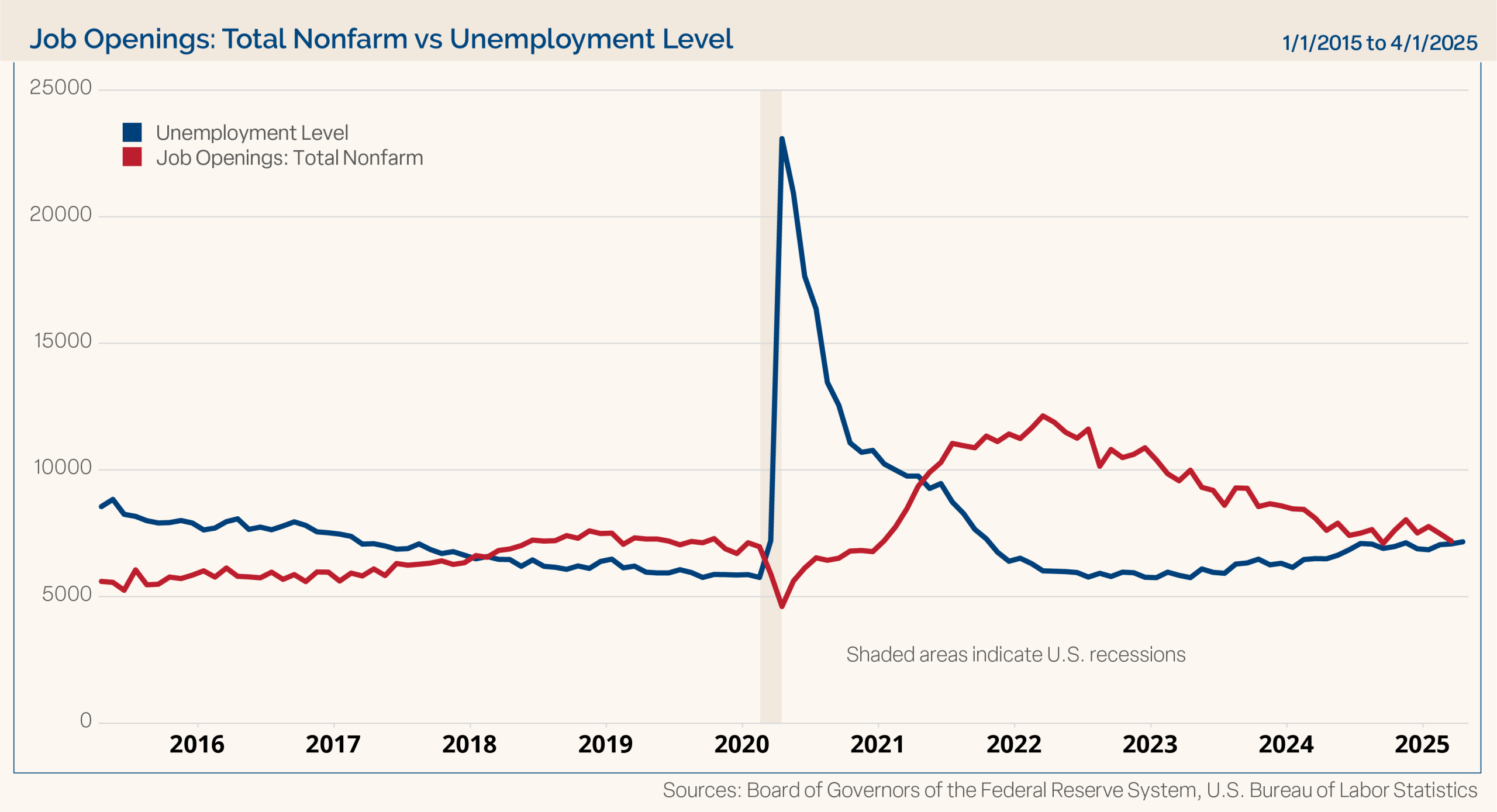 Jobs: The job market remained strong in April. Non-farm payrolls increased by 177,000, well ahead of expectations of 138,000. However, the prior month was revised to show more than 40,000 fewer additions than previously reported. The unemployment rate remained at 4.2%, as expected. Job openings dropped rather sharply in March to under 7.2 million from just below 7.5 million in February. Interestingly, layoffs also declined by 222,000 in March. This movement might have been an initial reflection of businesses pausing some of their hiring activity in light of the uncertainty around tariffs. At this point it looks like companies are slowing hiring, but they are not enacting massive layoffs. Due to the central role of consumers in the U.S. economy, we will continue to monitor job market data. Chart 1 shows the unemployment level and the number of job openings. Clearly the spread between these two measures has closed in recent years, and the job market is becoming more balanced between job seekers and jobs available.