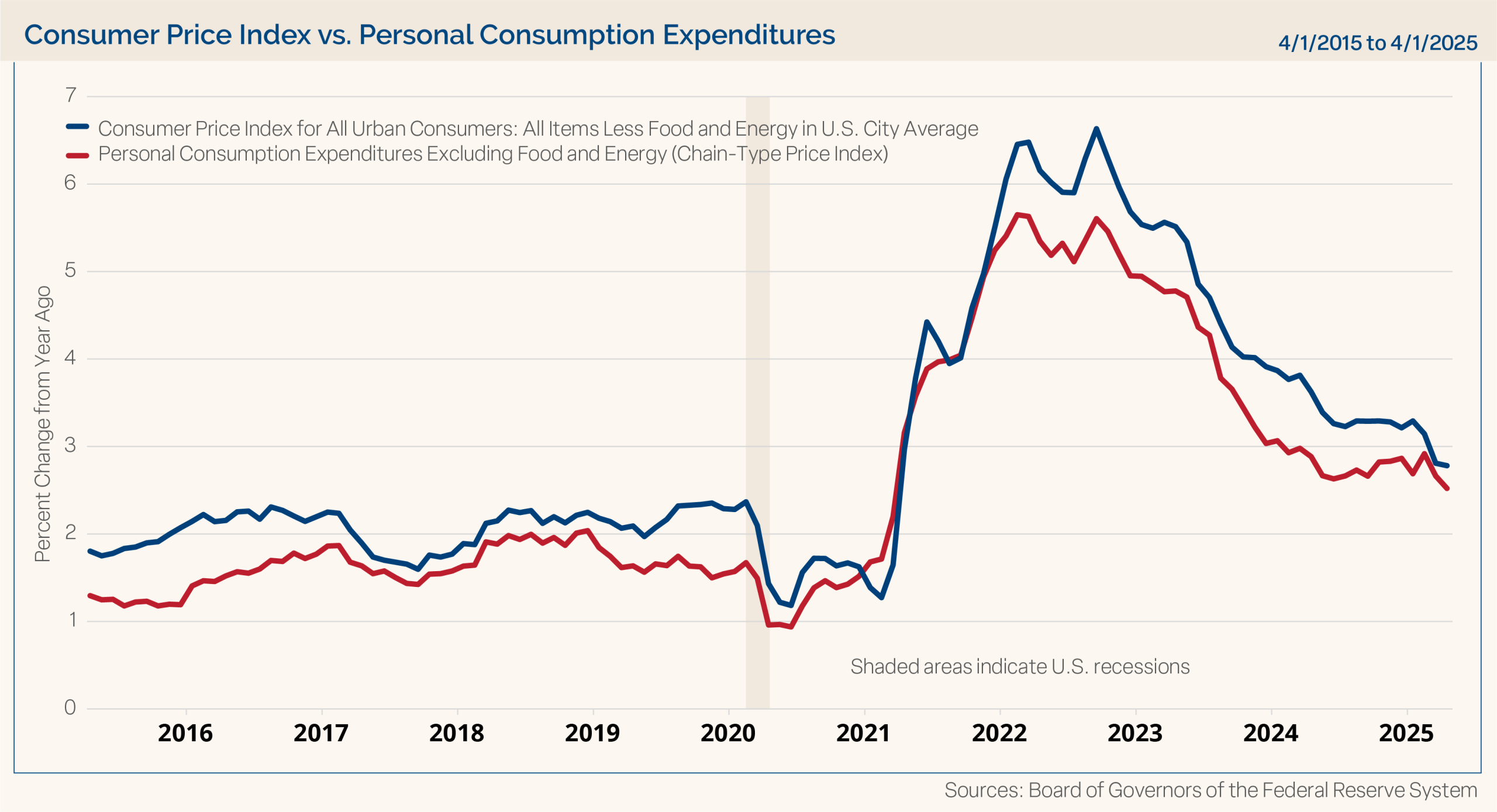 Overall, we believe inflation continues to make progress toward the Fed’s stated goal of around 2% for the core PCE price index reading. We expect this path to be bumpy, and tariff concerns have increased inflation fears and expectations, but we will wait to see if a real change will develop regarding pricing data. Inflation data over the last couple of months has shown ongoing improvement. Chart 2 shows the core CPI and core PCE price indices and the recent improvements in those price level readings.