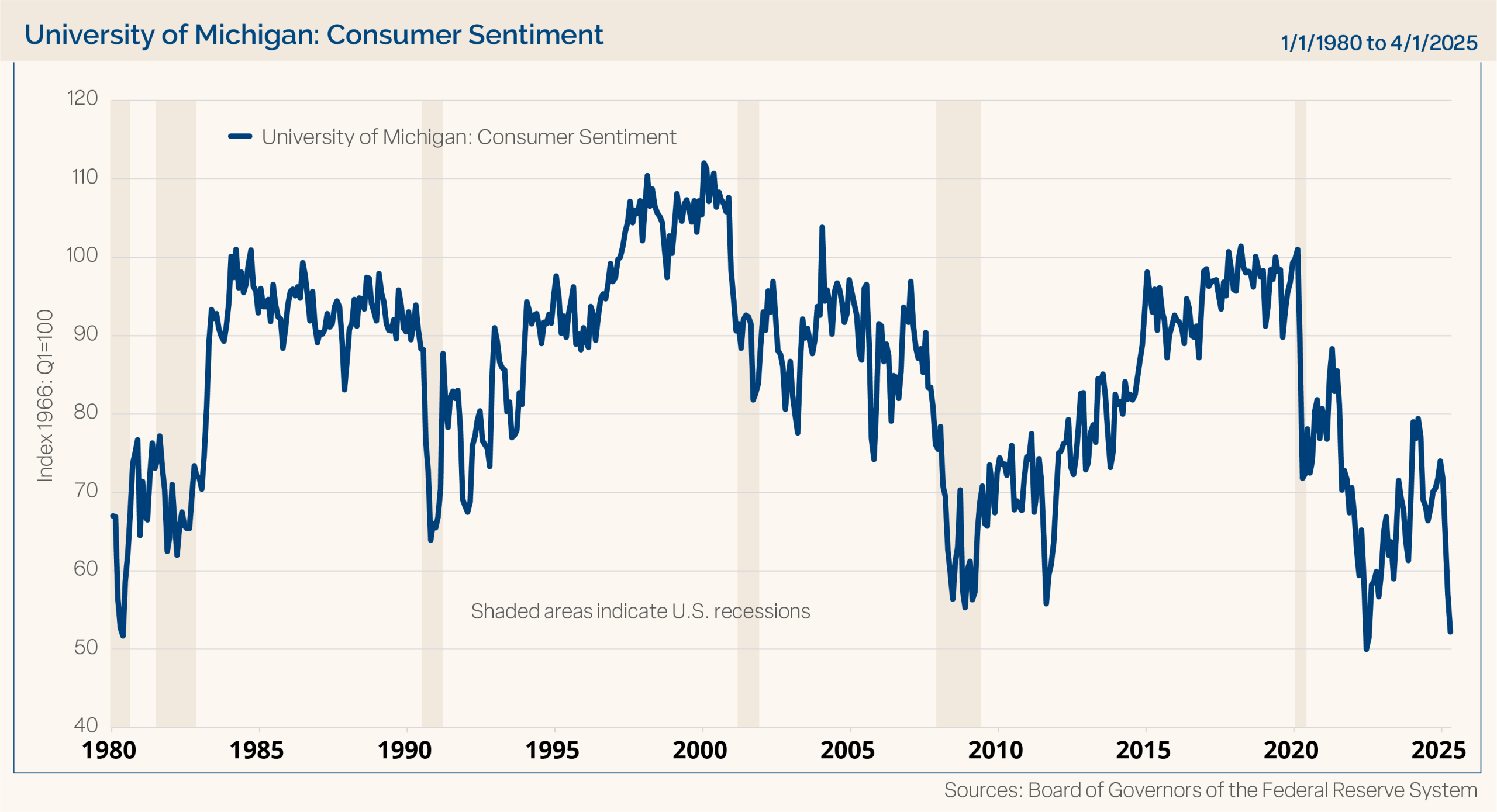 Consumer Confidence: One economic data point that has been heavily affected by the tariff discussions and resulting economic uncertainty has been consumer confidence. Consumers are clearly saying they are not as confident in 2025. The University of Michigan consumer sentiment reading has fallen dramatically in recent months. It is important to watch what consumers “say” in confidence surveys; however, we think it is more important to monitor what consumers “do,” meaning spending data. We will monitor whether this drop in consumer confidence translates into less spending by consumers in the months ahead. Chart 3 shows the consumer sentiment reading from the University of Michigan. It is remarkable to see how negatively consumers reacted to tariffs and the uncertainty that surrounded that event. As this chart shows, consumers have only been this negative a few times in the last 45 years. If some clarity develops around tariffs, it would not be a surprise to see consumer confidence start to rebound.