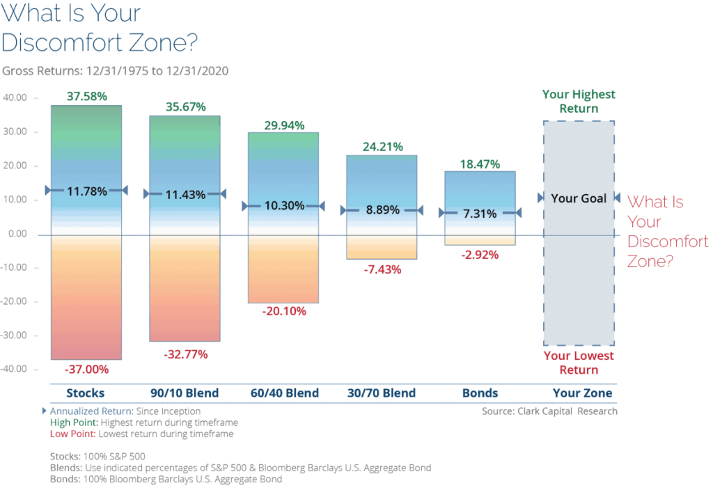 Stocks have historically been the best-performing asset class over time. Given that, if the only objective was total return, an investor would want a 100% equity portfolio. But the reality is that most investors shouldn’t want that, and in fact, they are often emotionally ill-equipped to handle the volatility associated with an all equity portfolio. When stocks prices decline, skittish investors will panic and cash out of their stock portfolios. We have seen this play out many times before. According to the Dalbar study, the S&P 500 Index earned 5.6%, while the average equity investor only earned 3.88% over a 20-year period[1].